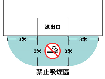 一般而言,3米约为一个成年人约6至7步距离。在该3米范围内不论是经过或停留均严禁吸烟。出入口外三米范围(法定禁烟区)的示意图如下:
